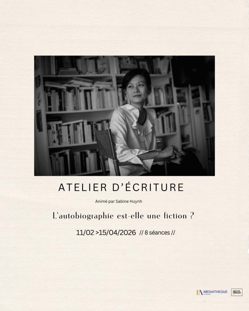 À partir du 11 février 2026 : L’autobiographie est-elle une fiction ? Atelier d’écriture hebdomadaire à l’Institut français de Tel Aviv. Durée : 8 séances de 1h30 chacune (de 18h00 à 19h30). Lieu : médiathèque de l’Institut français de Tel Aviv. Pour plus de renseignements, se rendre sur la page de l’Institut consacrée à l’atelier.